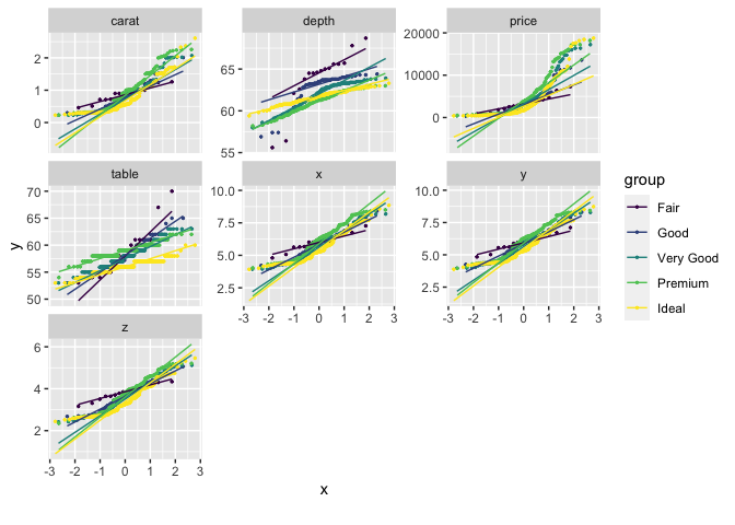 plot_qq(diamonds, by = "cut")