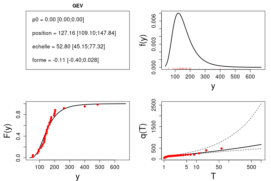 Deux fonctions sont fournies pour une estimation interactive Q=f(T) (quantile pour une période de retour donnée) ou T=f(Q) (période de retour associée à une valeur). Dans les deux cas le résultat inclut un intervalle d’incertitude.