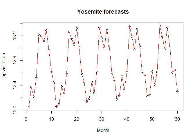 plot(yosemite_visitation_forecasts, main="Yosemite forecasts", type="l",xlab="Month", ylab="Log visitation")