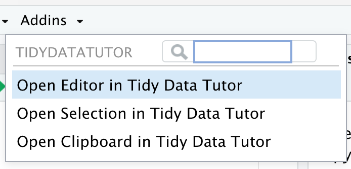 Access Tidy Data Tutor from the Addins drop down menu in RStudio:
